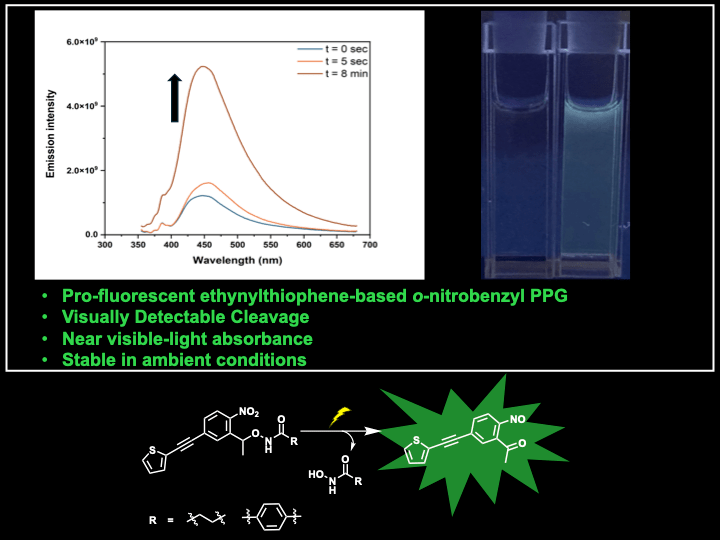 - Photolabile Protecting Groups (PPGs): We are developing a new class of thiophene-based o-nitrobenzyl photolabile protecting groups that absorb in the visible region of the electromagnetic spectrum, allowing milder reaction conditions and more selective light-triggered activation than traditional UV-responsive systems. A key target is the synthesis and controlled release of hydroxamic acids, which serve as important building blocks for anti-cancer drug candidates and are often challenging to prepare and handle by conventional routes. By incorporating these PPGs into light-responsive smart materials, we aim to enable on-demand photo cleavage of such biologically relevant molecules. This strategy broadens the scope of applications to targeted drug delivery, photo-responsive polymer architectures, and dynamic molecular devices.